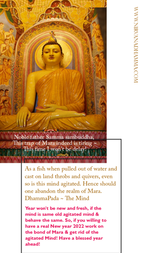 As a fish when pulled out of water and cast on land throbs and quivers, even so is this mind agitated. Hence should one abandon the realm of Mara. Year won’t be new and fresh, if the mind is same old agitated mind & behave the same. So, if you willing to have a real New year 2022 work on the bond of Mara & get rid of the agitated mind. This is the blessings from Nirvana Dhamma to Have a blessed year ahead!
