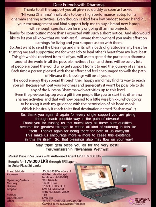 And in 2016, I received a contribution of LKR 180,000 to buy a laptop to continue the web activities and other dhamma activities I do for others. This is a Thanking note for all those wonderful beings who support for the continuation of healing hearts around the world with deep dhamma!